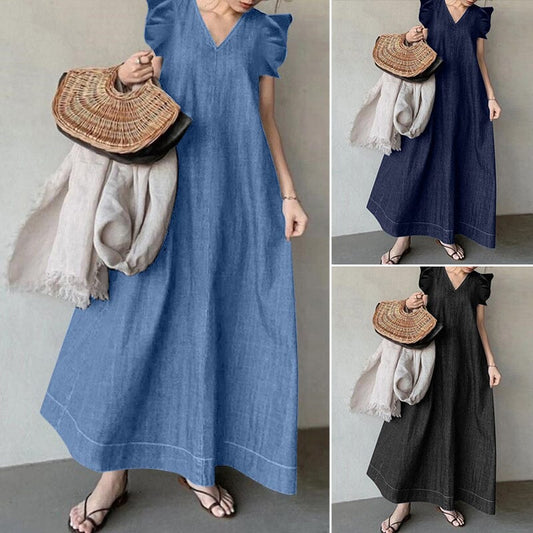 alwaysdwellTM - Denim V-neck Long Dress