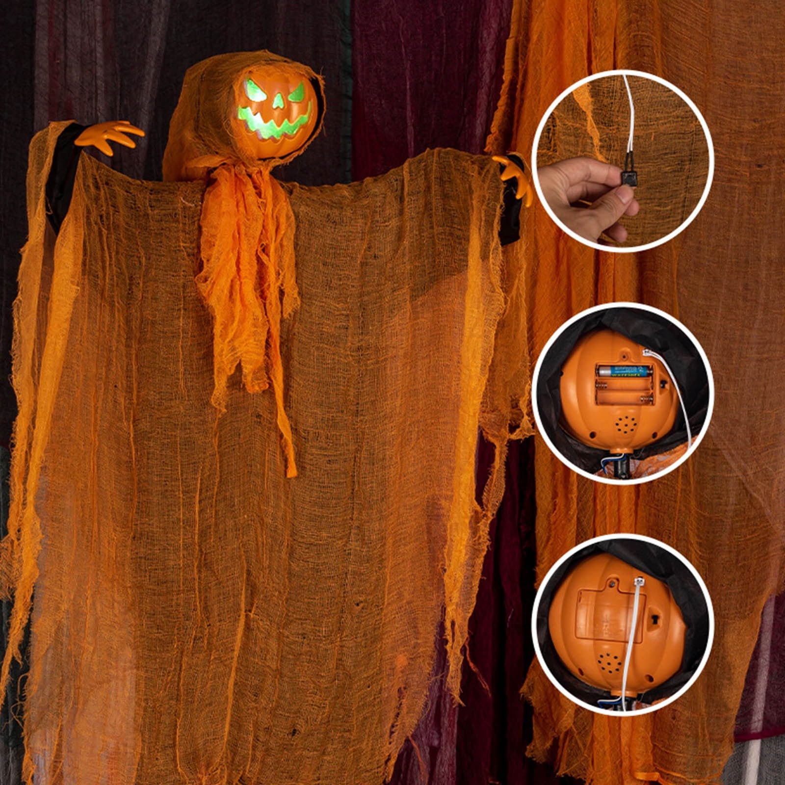 • The main feature of this decoration is its rotating pumpkin head. As it spins, it adds a dynamic and creepy element to your Halloween setup.