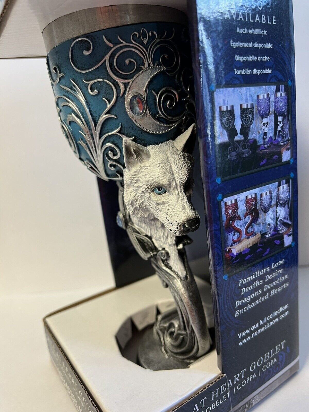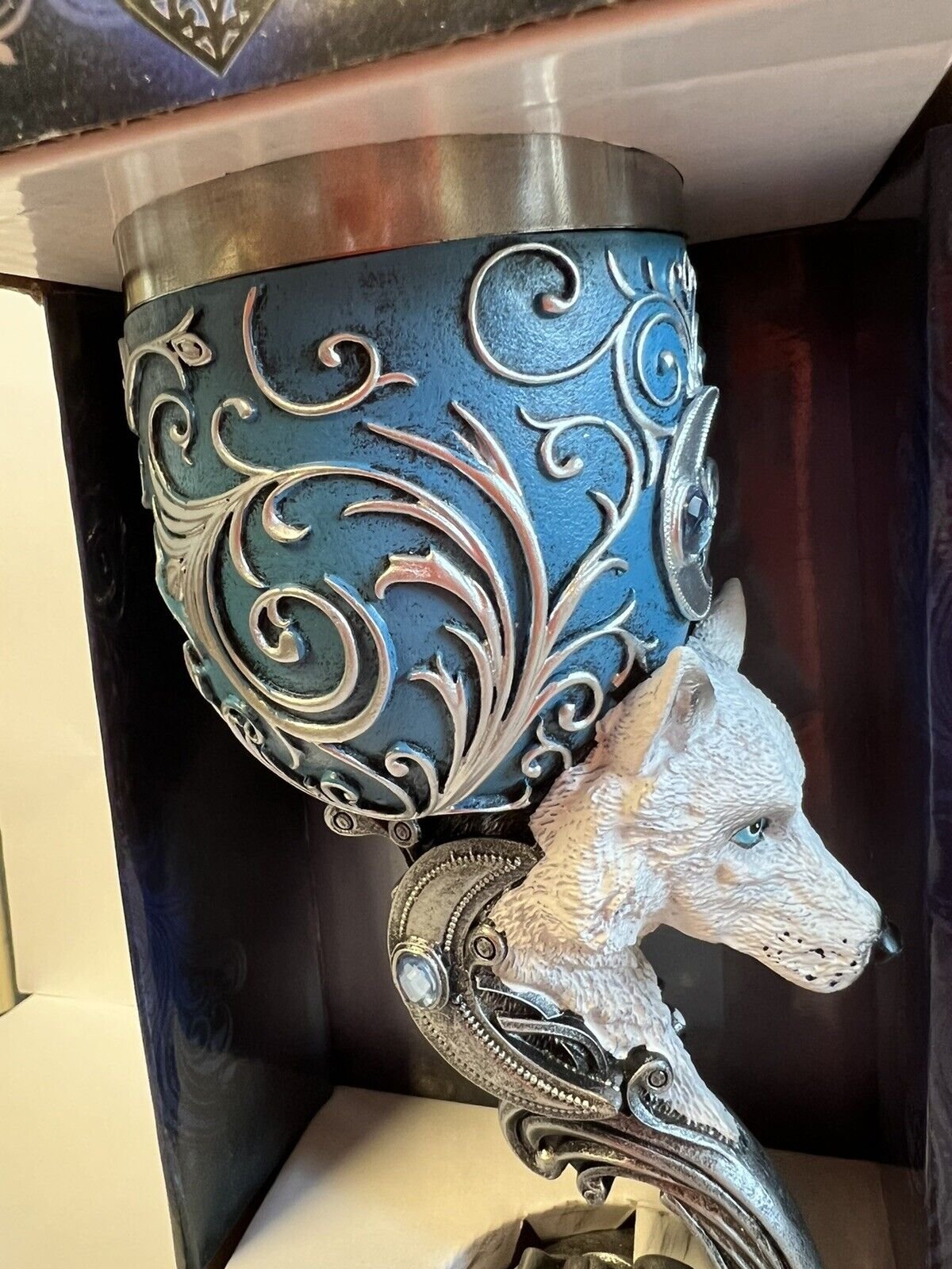 At the centre of the carefully sculpted stem is the head of a blue-eyed Winter Wolf protruding outwards. Above it is a crescent moon, at its heart is a blue gemstone.This personalized touch adds an extra layer of magic and makes it an exceptional gift that celebrates their love for the game.